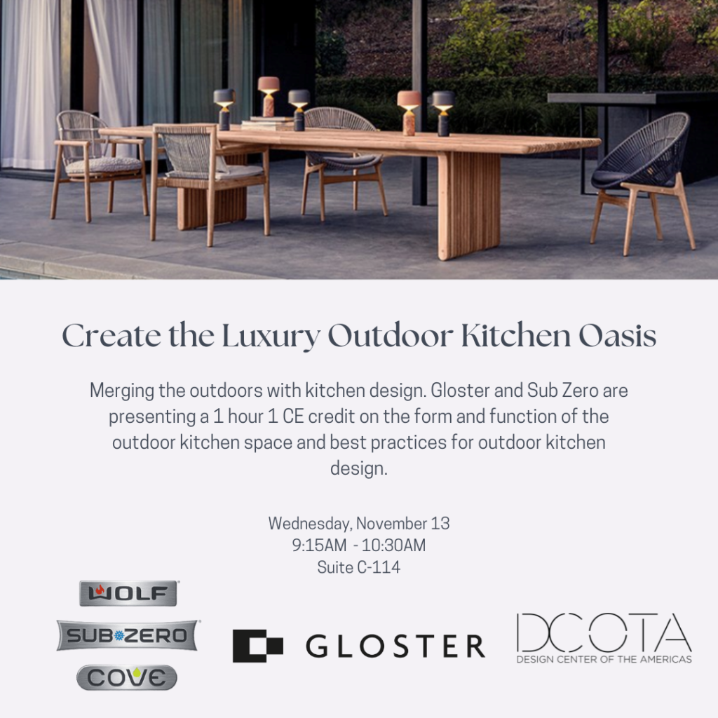 Merging the outdoors with kitchen design. Gloster and Sub Zero are presenting a 1 hour 1 CE credit on the form and function of the outdoor kitchen space and best practices for outdoor kitchen design.