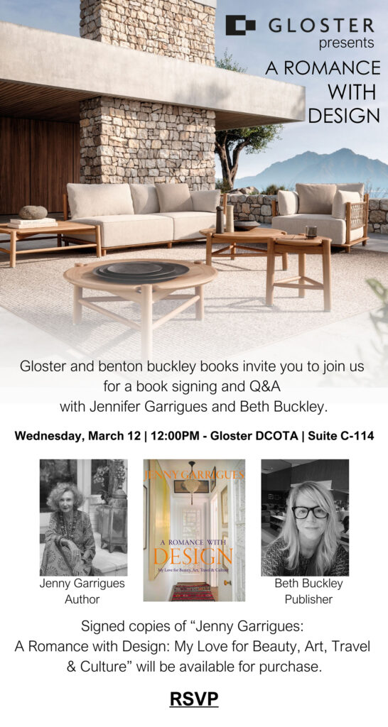 Signed copies of “Jenny Garrigues: A Romance with Design: My Love for Beauty, Art, Travel & Culture” will be available for purchase.