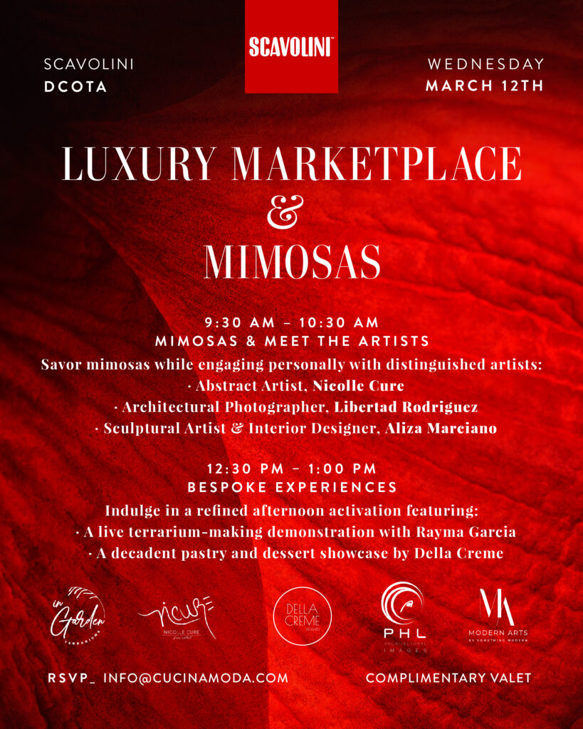 Savor mimosas while engaging personally with distinguished artists: Nicolle Cure an abstract painter, Libertad Rodriguez an architectural photographer & Aliza Murciano a sculptural artist.