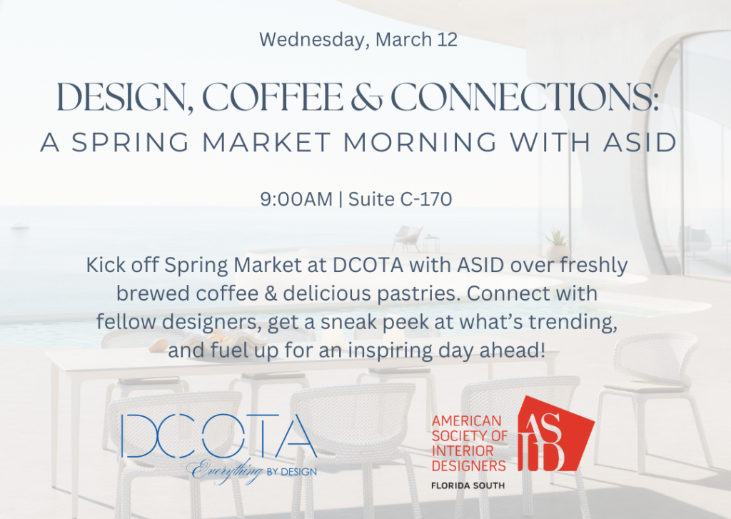 Kick off Spring Market at DCOTA with ASID over freshly brewed coffee & delicious pastries. Connect with fellow designers and fuel up for an inspiring day ahead!